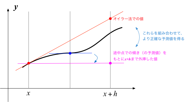 もう少し具体的には、下図のように、$x$と$x+h$の途中点での$y$の変化率(傾き)をまず予測し、その傾きを持つ直線を$x$から外挿し$x+h$での予測値を求める。 「現在」の$x$の傾きを外挿して得た予測値(オイラー法)とこれを組み合わせることで(例えば「平均」することで)、 図のように$y(x)$の変化が一様でない場合でも、予測の精度を上げられるのではないか?