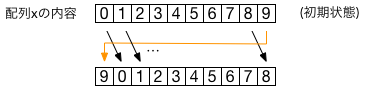 次の例題は、配列中のデータを、ひとつ「右」(添字が大きい位置)にずらし、一番「右」のデータは、 一番「左」に移動(つまりデータの位置を右向きにシフト、あるいは回転)し、結果を表示するCコードの例である。