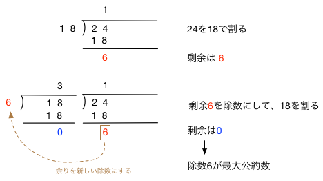 ここで、コンピュータの気持ちになって、gcd()関数がどのように計算を進めているのか、考えてみよう。 例えば、24と18の最大公約数を求めるプロセスを筆算で表すと