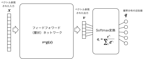 以上を踏まえると、ベクトル表現された$k$番目のパターン$\boldsymbol{x}^k=(x^k_1, \cdots, x^k_N)$と、それに対応する出力$y^k$が$j$番目のカテゴリーに属する確率 $q(\boldsymbol{x}^k,y^k=j)$ を出力するニューラルネットを、以下の図のように、設計することができる。