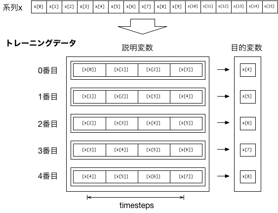 配列 x[i] に系列データが格納されているとしよう。 例えば、4ステップ分の情報から1ステップ先を予測できるよう学習させるには、 以下の図のようにトレーニングデータ(説明変数と目的変数の組)を準備すればよい。