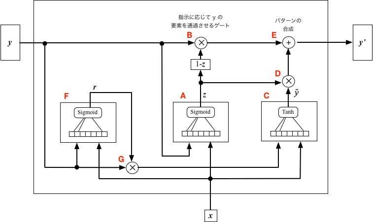 以下の式中では、ベクトル $\boldsymbol{x} = (x_1, \cdots, x_m)$と$\boldsymbol{y} = (y_1, \cdots, y_n)$の要素を並べて生成したベクトルを $$ \boldsymbol{x} \oplus \boldsymbol{y} = (x_1, \cdots, x_m, y_1, \cdots, y_n) $$ と表記することにする。 また、Aブロックの荷重ベクトルを $$ W^z = (W^z_1, \cdots, W^z_{m+n}) \\ $$ 等と表記する(他のブロックも同様)。 シグモイド関数を$\sigma ()$で表現することにすると、GRUにおいて、Aブロックの入出力関係は $$ \boldsymbol{z}(t) = \sigma\left(W^z \cdot (\boldsymbol{x}(t) \oplus \boldsymbol{y}(t) ) \right) \\ $$ Fブロックは $$ \boldsymbol{r}(t) = \sigma\left(W^r \cdot (\boldsymbol{x}(t) \oplus \boldsymbol{y}(t) ) \right) \\ $$ となる。 また、Aブロックでの更新ルールは $$ \boldsymbol{\tilde{y}}(t) = \tanh\left(W \cdot [\boldsymbol{x}(t) \oplus \{ \boldsymbol{r}(t) \otimes \boldsymbol{y}(t)\} ] \right) \\ $$ とする。そして、最終的なユニットの出力は、$\boldsymbol{y}(t)$ と $\boldsymbol{\tilde{y}}(t)$ の要素毎の平均、すなわち $$ \boldsymbol{y}(t+1) = (\boldsymbol{1} - \boldsymbol{z}(t)) \otimes \boldsymbol{y}(t) + \boldsymbol{z}(t) \otimes \boldsymbol{\tilde{y}}(t) $$ とする。 ここで $\boldsymbol{1} = (1,1, \cdots, 1)$である。