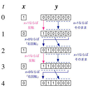 もしも入力が$x=(0)$であれば、最初の$\boldsymbol{y}$の状態が6ステップ周期で繰り返されるので、 これは繰り返しパターンを記憶したり・生成したりできる装置とみなせる。 また、$x=(1)$よって、そのパターンを書き換えることも可能となる。
