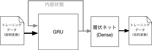 そして、以下のような構造のモデルを構成し、入力(説明変数)に対応した出力(目的変数)が得られるように、トレーニングさせる。 ここで、GRUの内部状態を、得たい出力に変換するため、GRUの出力にさらに層状ネットワークを接続する。