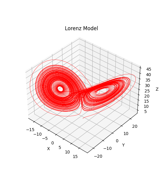 大気変動を単純化したモデルとして、気象学者のE. N. Lorenz は対流運動を単純化した微分方程式を考案し調べた。 モデルの導出には専門的な知識と少々面倒が計算が必要なのでここでは割愛し、その結果のみを示すことにする。