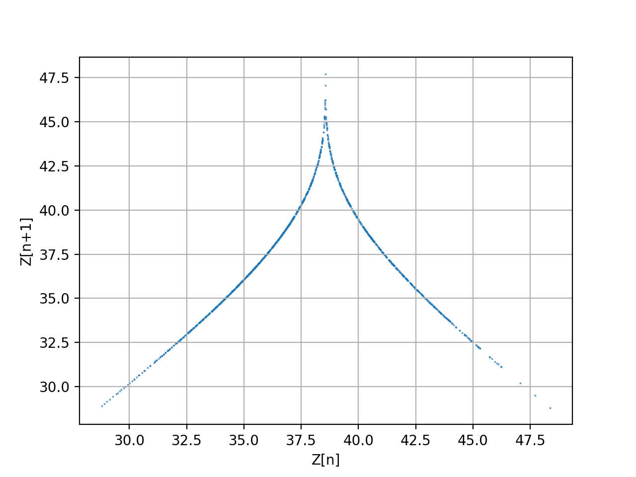 不規則に変動している$Z(t)$が、ある時点$t_n$で最大値をとり、その後減少した後、再び$t_{n+1}$で最大になったとする。 そのとき、横軸に$Z(t_n)$、縦軸に$Z(t_{n+1})$をプロットすると、以下のように「テント」のようなグラフが得られる。 これは、$n$番目の最大値と$n+1$番目の最大値の写像関係を与えるもので、ローレンツプロットと呼ばれている。