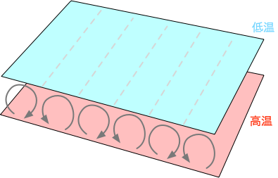 箱の中に水などの流体を入れて、下を温めて、上を冷やすと、対流が起こる。 具だくさんではない味噌汁を、熱いうちに上から眺めると、味噌の濃淡が生じているのが確認できるが、それも対流の仕業である。