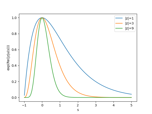 積分路をこの最急降下の道を通るようにして、$|z|$を大きくすると、$e^{|z| u(s)}$ はガウス型の関数形に近づいていく。 簡単のため$\alpha=0$とすると、最急降下の道は実軸に沿った経路となるが、そのときの$e^{|z| u(s)}$の様子を $|z|$を変えながらプロットしてみると以下のようになる。