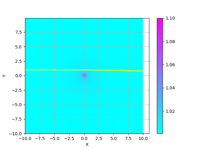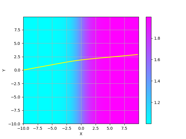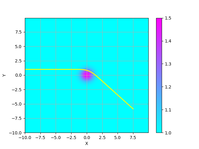 ここでは、原点の周りに屈折率が大きいスポットが $$ n(x,y) = 1 + \frac{\exp(-x^2-y^2)}{2} $$ のように分布していると仮定する。 そこに、$(x,y)= (-10,1.0)$から、x軸に平行な光線が入射する場合の光路を計算し、プロットするコードの例を以下に示す。