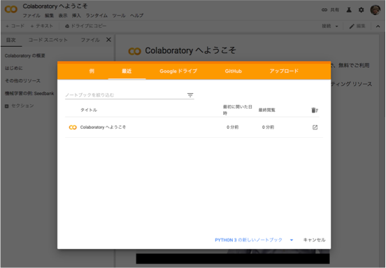 - 3分間の解説動画 Colabのご紹介(英語)を視聴してください。英語がわからなくても、画面だけ眺めておけば大丈夫です。