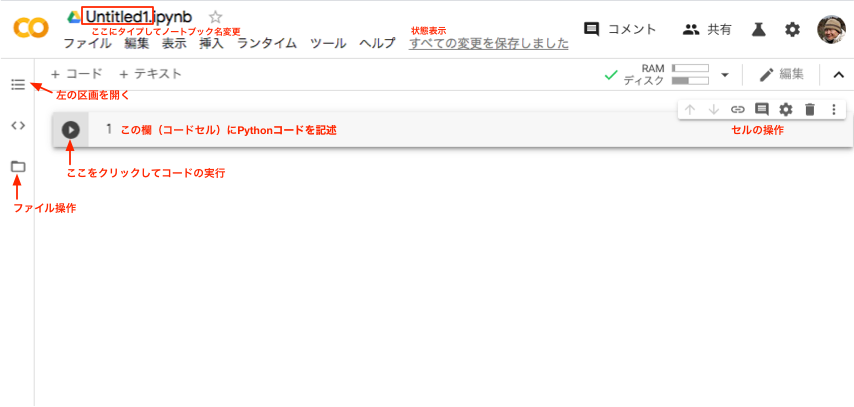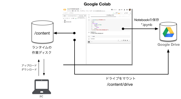 - 一方、作業用のデータは、ランタイム(後で説明)を再起動する度に、消えてしまいます。必要なデータは、Googe Driveに移動したり、各自のPCにダウンロードして保存しておく必要があります。