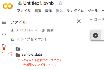 使用中のノートブック毎に仮想的な実行環境(ランタイム)が生成され、作業用のファイルスペースが設けられます。それを操作するには、左側の区画のファイルタブを開いてください(フォルダーのアイコンをクリック)。 そこには、あらかじめ、機械学習のサンプル用のデータが保存されています。