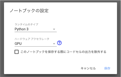 機械学習などの課題で、計算にGPUを用いる場合は、メニューからランタイムを開き、ランタイムのタイプを変更を選択します。 そして、ハードウェアアクセラレータの欄をGPU に変更します。この変更を加えると、ランタイムが再起動され、作業途中のファイルが削除されますの注意してください。