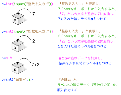 a=int(input("整数を入力:"))動作:"整数を入力:"と出力し待機、キーボードから入力した内容を整数に変換して変数aにセットする-