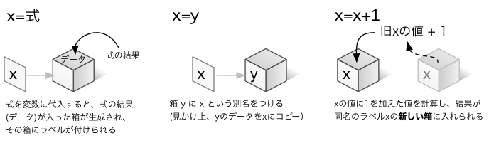 x = yは、ラベル y の箱に、さらに x というラベルを貼り付ける操作(見かけ上、y のデータを x に移すのと等価。その結果、箱には x と y という2つのラベルが貼られる)。 - 代入操作