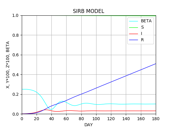 コードを実行してみると、$\beta$は徐々に下降し、患者数が一定になるようなところ($R_0=1$が達成されるところ)で落ち着くことがわかる。 $0.25$を$0.1$まで落としたことになるので、接触を $0.1/0.25 = 0.4$ まで下げたこと(60%削減)に相当する。 そして、その後の患者数はほぼ一定のまま推移する。