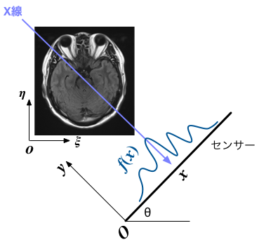 X線のように指向性と透過性の強い電磁波を物体に照射すると、内部の組成や密度に応じて吸収され、「反対側」で検出される信号の強度が変化する。 線源を並行移動しながらスキャンすることで、ある方向から見た、吸収の程度の分布を得ることができる。 センサーの方向角を $\theta$、センサー上の位置を $x$とし、その点での吸収率(信号強度から換算)を $f(\theta,x)$ と表すことにしよう。
