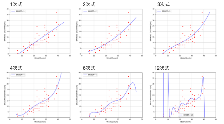 実際に、上記の自動車の制動距離の例で、多項式の次数を増やすことで、RSSが一貫して低下する様子を確認しなさい。