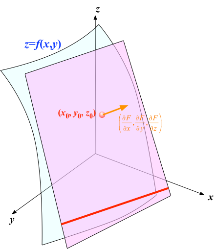 また$g$についても全く同様に $$ \frac{\partial g(x_0,y_0)}{\partial x} (x-x_0) + \frac{\partial g(x_0,y_0)}{\partial y} (y-y_0) = - g(x_0,y_0) $$ となる。