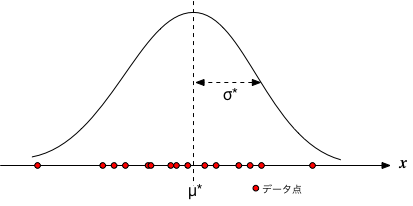 仮に、平均が$\mu$、分散が$\sigma^2$とすれば、そのとき、$x$という値が得られる確率を考えると、 $$ p(x | \mu,\sigma)=\frac{1}{\sqrt{2\pi} \sigma} e^{-\frac{(x-\mu)^2}{2\sigma^2}} $$ となる。 そうすると、$N$個のデータが得られる確率、すなわち、データ全体についての結合確率は、独立事象を仮定しているのだから、 $$ P(X|\mu,\sigma)=\prod_{i=0}^{N-1} p(x_i | \mu,\sigma) $$ となる。 この確率†は、あるモデルのもとで、そのデータセットが得られる尤もらしさ(尤度)を表す。