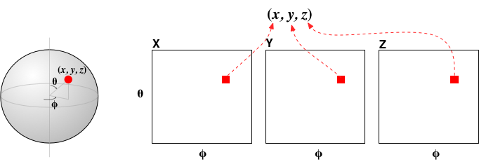 緯度($\theta$)と経度($\phi$)を、三次元座標に対応付ける方法。x,y,z座標のそれぞれについて、$(\theta,\phi)$の各点の値を表(配列)によって与える。