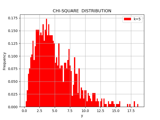平均0、分散1の正規分布に従うような互いに独立な$k$個の確率変数の組$\{X_1, X_2, \cdots, X_k \}$を考えよう。 そして、これらの二乗和によって「合成」された確率変数 $$ Y = {X_1}^2 + {X_2}^2 + \cdots + {X_k}^2 $$ がどのような振る舞いをするか、考えてみよう。 二乗しているのだから、$Y$が非負の値しか取れないのはもちろんのこととして、 分布も正規分布からは「歪んで」いるはずである。