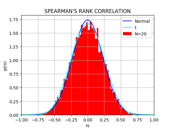 順位が全く無相関な場合、データ数が多くなると、$r_s$ の分布は平均0、分散 $1/(n-1)$ の正規分布で近似できる。 上のPythonコードでは、$N=20$の場合について10000回の試行を行って得た$r_s$の分布と、対応する正規分布(青色)、および t分布(水色; $t$を$r_s$に変数変換)を重ねて描いている。右図はその結果である。