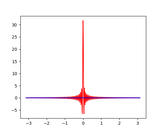 $q$を$(-100,100)$の範囲で変えながら、$\cos(qx)$と$\sin(qx)$を加え合わせるだけのシンプルなコードである。 以下のプロットが実行結果の例で、赤が実部、青が虚部になる。 $\cos(qx)$は、$x=0$でのみ位相が揃うので大きなピークを呈するが、$x$の他の値では異なる位相の値が打ち消しあう様子が見て取れる。