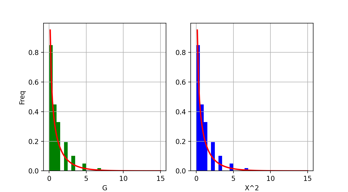そこで、改めて、 $$ G = 2 N D_{\textrm{KL}}( O \Vert E) = 2 \sum_i o_i \log\left( \frac{o_i}{e_i} \right) $$ を定義すると、この$G$は、ピアソンのカイ二乗統計量と同様な統計(分布と自由度)に従うと期待できるため、 この$G$を使って適合度検定を行うことができる。 (サンプル数が少ない場合でも、むしろ、カイ二乗統計量よりもカイ二乗分布に近い振る舞いをすると言われている)。