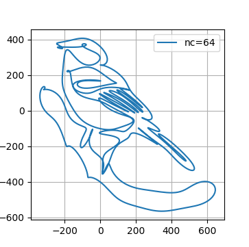 写真の鳥(シジュウカラ)の外形を「閉じた一筆書き」でトレースして、座標に変換したデータファイル great-tit-drawing.txtを用意した。 このデータファイルでは、一筆書きの全体の線の長さを1024等分し、それぞれの点のx座標とy座標の値がリストされている。