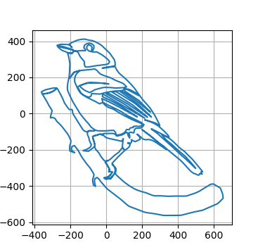 以下のPythonコードを使って、座標を読み出してプロットすると、鳥の一筆書きが表示される。