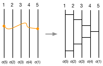 あみだくじの過程をよく考えると、横棒の箇所で、行き先が入れ替わっていることがすぐわかる。 つまり、横棒=隣同士の互換、という対応関係がある。 $i$番目の縦棒と$j$番目の入れ替えを$(i \;\; j)$と書くことにすると、上に示したくじの横棒と互換との対応は以下のようになる: