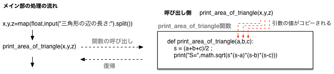 上記の例では、三角形の3つの辺の長さが、関数print_area_of_triangle()に受け渡されている様子がすぐに想像できるだろう。