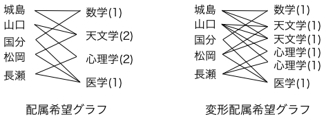 - これらの条件のもとで、希望先に配属される学生の数が最大となるように、学生の配属先をひとつずつ決める。