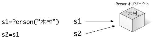 のようなコードを実行すると、実際に変数s1にセットされるのは、「木村」オブジェクトの参照先(箱の場所)である。