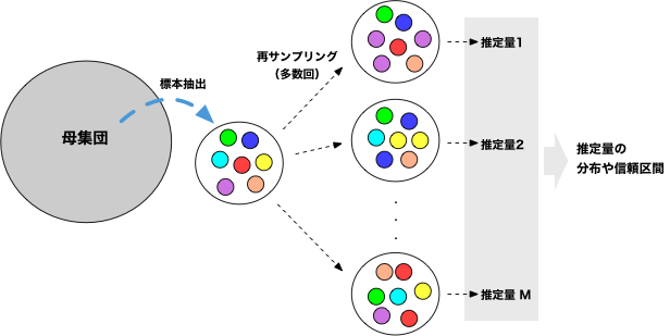 そうやって水増ししたデータを作成してから標本を得る代わりに、100人分のサンプルから、重複を許しながらサンプルし直しても同じことである。 このように、標本を元にサンプルを取り直し、それを元に推定値の分布や信頼区間を議論する方法をブートストラップ法(bootstrap method)と呼ぶ。 Bootstrapという語は「少ない資源をうまくやりくりして、次の段階に繋げる」といったニュアンスで使われるので、少数のサンプルから母数を推定する、といったイメージで用いられるようになったのだろう。