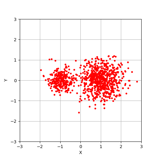 ここでは「目に見えない」2つのポテンシャル(番号1と2)があって、粒子はそのどちらかに捕捉(トラップ)されながら「行ったり来たり」 しているような状況を想定してみよう。そして、全体的な粒子の分布が単純に2つのガウス分布の重ね合わせ(混合) $$ p(x,y) = \frac{\alpha_1}{2 \pi {\delta_1}^2} \exp\left[ - \frac{(x-x_{c_1})^2 + (y-y_{c_1})^2}{2 {\delta_1}^2} \right] + \frac{\alpha_2}{2 \pi {\delta_2}^2} \exp\left[ - \frac{(x-x_{c_2})^2 + (y-y_{c_2})^2}{2 {\delta_2}^2} \right] $$ で表すことができると仮定する。 $\alpha_1, \alpha_2$はそれぞれのガウス分布の分配比率を表すパラメータで、$\alpha_1 + \alpha_2 = 1$。