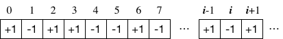 図のように、一次元的に、+1と-1の状態を持つ小さな磁石(スピン)が並んでいて、隣同士と影響を及ぼし合っているとしよう。 ここでは、隣の向きが揃っている(+1と+1、または-1と-1)と $-J$ のエネルギーが、向きが逆の場合(+1と-1または-1と+1)は $+J$ のエネルギーが生じる 場合について考えよう。 また、系全体に外部磁場 $H$ が加わっているとする。 $i$番目のスピンの状態を変数 $s_i$ で表すことにすると、全体としてのエネルギー $E$ は $$ E(s_0, s_1, \cdots, s_i, \cdots) = -J \sum_i s_i s_{i+1} - H \sum_i s_i $$ となる。 これは、一次元イジング模型と呼ばれている。