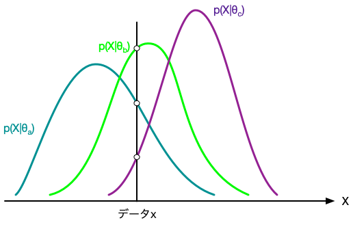 分布関数のパラメータによって、与えられたデータに対する尤度が変化する様子