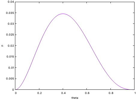 実際に微分をとって最大値を与える$\theta$を求めてみると $$ \frac{\partial}{\partial \theta} p(X=[H, T, T, H, T]|\theta) = 2 \theta (1-\theta)^3 - 3 \theta^2 (1-\theta)^2 = \theta (1-\theta)^2 (2 - 5 \theta) = 0 $$ とおいて $$ \theta = \frac{2}{5} $$ が得られる。