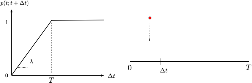 ある時刻$t$から、わずかな時間間隔$\Delta t$の間に、それらのイベントが発生する確率が時間間隔に比例する、すなわち $$ p(t ; t+\Delta t) = \lambda \Delta t + O(\Delta t^2) $$ であるような場合について考えてみよう。 すると、イベントが発生しない確率は $$ q(t; t+\Delta t) = 1 - \lambda \Delta t + O(\Delta t^2) $$ ということになる。