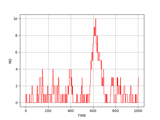以下は $\tau_c=10, \, \tau_s=5$の場合のシミュレーション例である。 横軸が時間、縦軸がレジ待ち人数を表す。 確率的に、ときおり列が長くなる場合があることが分かる。