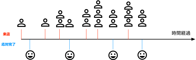 レジに1人以上の客が並んだ状態では、接客中に別の客が新たに加わる場合と、待っている客への対応が完了する(すなわち列が1人減る)場合がある。