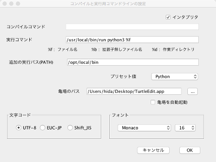 亀場を使う場合は、亀場を自動起動にチェックを入れておくことで、Pythonコードの実行と同時に、亀場サーバーが自動的に起動されます。 亀場が必要無い場合は、チェックを外しておきます。