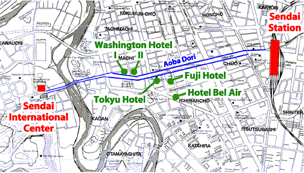 AccommodationThe Organizing Committee has reserved sufficient rooms at discount convention rates to accommodate all participants and accompanying persons. The Accommodation Reservation Form B ( PDF/ HTML ) should be sent by postal mail or fax to Tohoku Communications Inc. (TCS) before October 4. If a room at your first choice hotel is unavailable, the second choice (or third choice) hotel will be assigned. Reservation confirmation and the estimation for the total room charge will be sent to you by E-mail or fax. A brief map around the conference site is here.