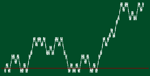 この生成規則にしたがってさらに反復を繰り返すと下図のような グラフが得られる.グラフと水平線(赤線)との交差する点集合の フラクタル次元は1/2である.