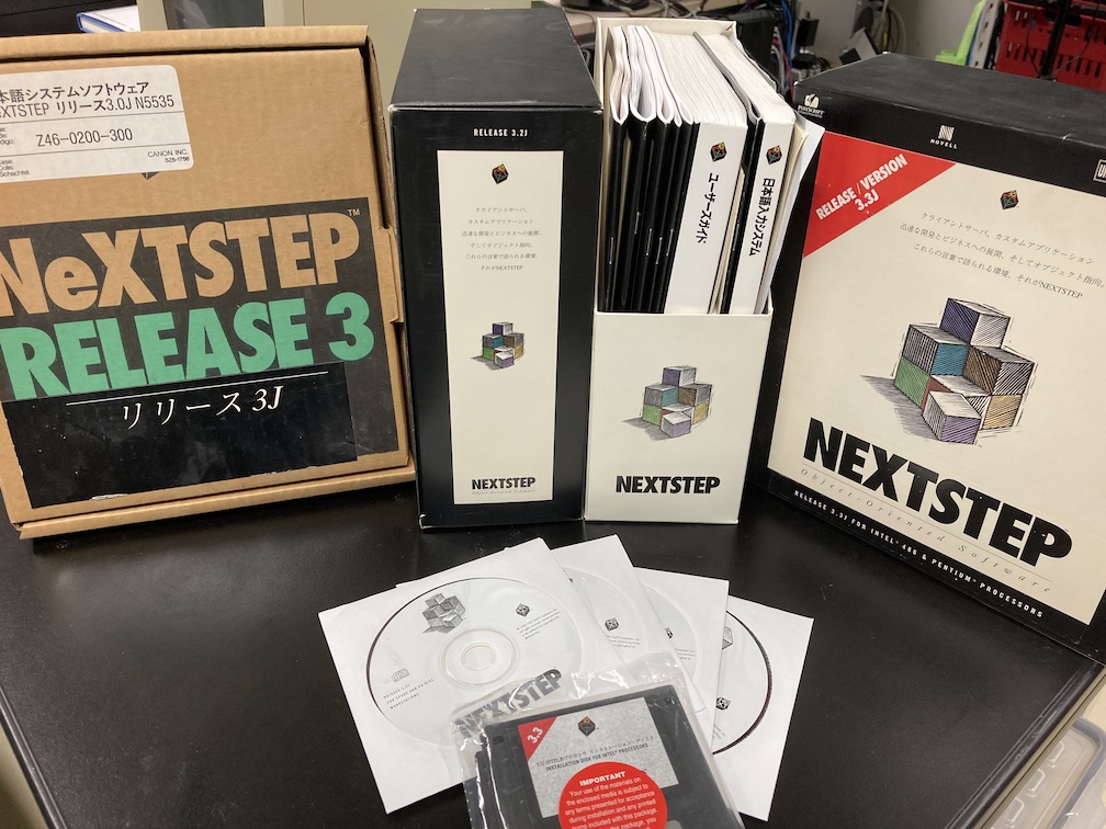 部屋の片付けがきっかけとなり、 その昔、専用ソフトで作った図面やグラフを開いたり、自作のソフトウェアをコンパイルして動かしてみようかと思い立ち、 オフィスの棚の隅に押し込んであった、NEXTSTEP 3.0J, NEXTSTEP 3.2J, そしてNEXTSTEP 3.3Jのボックスを引っ張り出してみた。