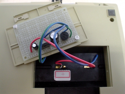 使うたびに定電圧電源を持ち出すのも大変なので、本来バッテリーパックの入るスペースに、3端子レギュレータを使った簡単な電源を増設してみた。極性や電圧を間違っても本体が壊れないように、ブリッジダイオードで受けてから、7805で5Vに変換。本体裏の蓋に小さな基盤を取り付けて、出力をバッテリーパックのコネクタに直接半田付けした。最初は、NiCd電池を買って来て、ニセバッテリーパックを作ろうかとも思ったが、もともと卓上型なので、immobile仕様と割り切った。