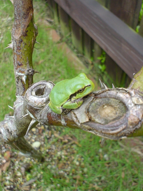 その日も妻が、「ナデちゃんが来ている」というので庭に出てみると、小刻みに呼吸しながら、バラの枝で日向ぼっこをしていた。カメラを近づけると、そのナデちゃんは、迷惑そうにチラッとこちらを見た。