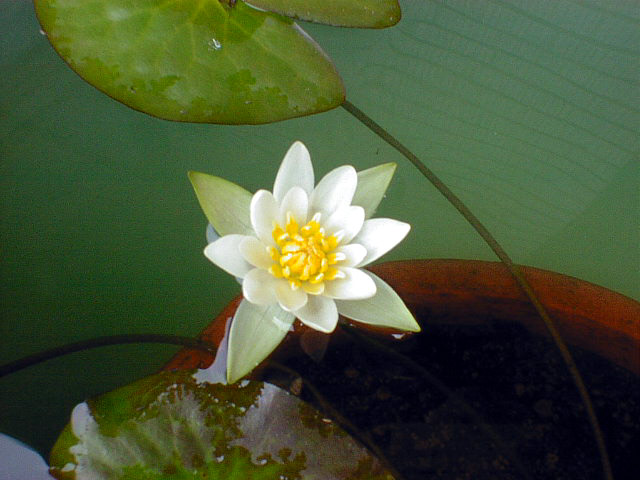 今はもう仕事が忙しくてそれどころではなくなってしまったけれど、しばらく前は妻と僕はよく庭いじりをしていた。これは ひつじぐさ というのだそうだ。40cmくらいの焼き物の器に水を張って、その中に鉢を沈めた格好になっている。 雨が降って水位が上がっても、いい天気が続いて水位が下がっても、いつもそれなりに浮かんでいられる。茎は水位の変化を見越して、すこし長めになっているみたいだ。